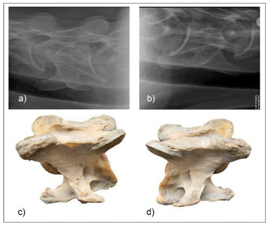 Radiographic images of the lateral 30° dorsal to ventral oblique left (a) and right (b) of C6 of horse M1 with the vertebrae left (c) and right (d) below. (Image (b) and (d) have been left in nonstandard orientation to appreciate the three-dimensional osseous form).