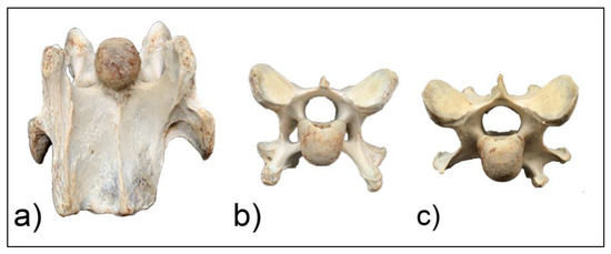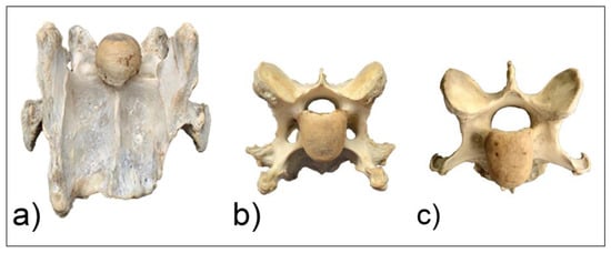 Two horses (F1, M1) presented with unilateral morphological variations of C6. In horse F1, C7 was also affected, which has been noted to be more common in females [12]. Postmortem examination of horses M1 (Figure 5 and Figure 6) and F1 (Figure 7 and Figure 8) revealed morphological variations consistent with radiographic images and confirming the diagnosis of ECCMV in both cases. The remaining horse (M2) presented with a symmetrical bilateral variation of C6 (Figure 9), with transposition on to C7 visible on the radiographs (Figure 9c). The morphological variations can be appreciated in the ventral and cranial views of the bones, as well as the 30° oblique views (Figure 6 and Figure 8).