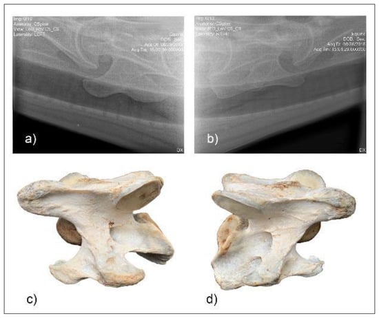 Radiographic images of the lateral 30° dorsal to ventral oblique left (a) and right (b) of C6 of horse F1 with the vertebrae left (c) and right (b) below. (Image (b) and (d) have been left in nonstandard orientation to appreciate the three-dimensional osseous form).