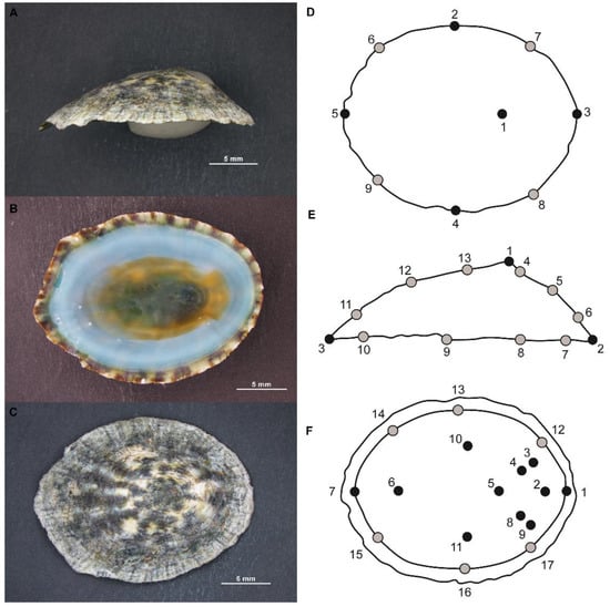 Lottia mesoleuca (Menke, 1851) representation in A: lateral, B: vental and C dorsal view and their schematic diagram with the representation of the distribution of landmarks in the three positions (A,D)—Dorsal (9 landmarks), (B,E)—Lateral (13 landmarks) and (C,F)—Ventral (17 landmarks).