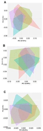 To analyze the information of shape, the effects from position, orientation and scale are removed by a generalized Procrustes superimposition analysis [1,39,40]. In order to see the differences or similarities in body shape of the species, a principal component analysis (PCA) was conducted in the program R 3.5.0 using the package geomorph [41,42]. This is one of the simplest multivariate techniques intended to synthesize information reducing the dimensionality of variables, so that the least information possible is lost and data variation can be described properly [43,44].