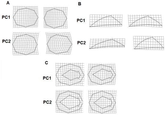 - Klingenberg, C.P. MorphoJ: An integrated software package for geometric morphometrics. Mol. Ecol. Resour. 2011, 11, 353–357. [Google Scholar] [CrossRef]