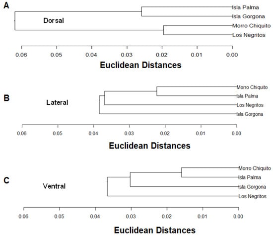 Once the Euclidian distance matrices for similarity have been completed, the analysis for grouping by the Ward method was conducted, which is more discriminatory, in order to determine the grouping levels. A grouping for all the views was performed (Figure 4). Similarities in the dorsal view are more between individuals of Palma Island and Gorgona Island, and between those of Morro Chiquito and Los Negritos. The lateral view shows similarity between individuals from Morro Chiquito and Palma Island, followed by Los Negritos and Gorgona Island, which have similar features in the type of rock. The ventral view is perhaps the most variable in shape, which may be caused by differences in the type of rock that each population predominantly lives upon. Variation in rock type may be associated with ontogenetic variation [49,50,51], showing, therefore, that similarities are in the individuals from Morro Chiquito and Palma Island, followed by those from Gorgona Island and the least similar ones in Los Negritos.