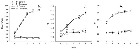 The effects of cinnamon (control vs. 1.5%) supplementation on thermoregulatory responses in pigs housed at 20 °C (thermoneutral, TN) or 35 °C (heat stress, HS) for 7 day. Heat stress increased (a) respiration rate, (b) rectal and (c) skin temperature (p < 0.001 for all). No effects of cinnamon on thermoregulatory responses were observed.