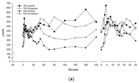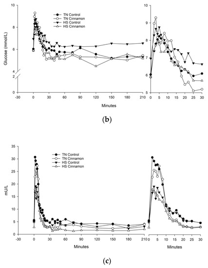 Difference in glucose and insulin responses to the IVGTT were quantified using area under the curve analysis (AUC), calculated by the trapezoidal rule. Results of the IVGTT were quantified with minimal modelling using a computer program [21]. Parameters calculated by MINMOD were: basal glucose (Gb); basal insulin (Ib); insulin sensitivity (Si), which quantifies insulin stimulated disposal by GLUT-4; glucose effectiveness (Sg), which quantifies insulin independent glucose disposal by GLUT-1; acute insulin response to glucose (AIRg), which reflects the acute insulin secretion and pancreatic responsivity; disposition index (DI = AIRg × Si), which combines the parameters of insulin responsiveness and insulin dependent glucose disposal. Paradigm modelling of the homeostatic measures (HOMA) β-cell function and insulin resistance were calculated by MINMOD. A Quantitative Insulin sensitivity Check Index (QUICKI) was calculated from Gb and Ib (1/log Gb + log Ib), plus a modified QUICKI (mQUICKI) to include basal NEFA (1/log Gb + log Ib + log NEFAb) [22]. Paradigm modelling was performed on the average of baseline (−30, −15 and −1 min). Four pigs were excluded from the modelling due to a lack of fit, with the final replication per treatment being nine, six, eight and eight for TN control, TN cinnamon, HS control and HS cinnamon, respectively.