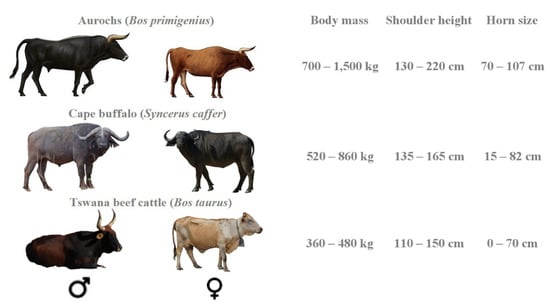 Morphological characteristics of the Aurochs, Cape buffalo, and Tswana beef cattle with adult measurements. Data sources: [14,16,17,18,19], own data. Aurochs graphics retrieved from [20].
