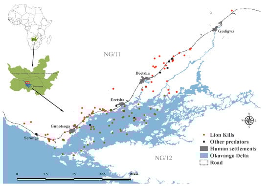 Between June 2016 and June 2018, we studied livestock depredation in the eastern Panhandle region of the Okavango Delta (Figure 2), a large inland wetland in Botswana that is characterised by annually variable seasonal flooding [21]. Along the Delta’s periphery, livestock are predominantly free-ranging across unrestricted communal pastures that include a diverse mix of dry savannah woodlands and wetland habitats [22]. This ecosystem mosaic provides critical functional heterogeneity of seasonal habitats for wild and domestic herbivores [6,23]. The Delta also supports one of the last strongholds of free-ranging lions [24,25] and forms part of the Kavango Zambezi Transfrontier Conservation Area. Our study area encompassed five main villages and 44 remote cattle posts located along the boundary of NG/11 and NG/12 communal multiuse areas (Figure 2) that are characterised by settlement, subsistence agriculture, livestock rearing, and nonconsumptive wildlife tourism. From randomised herd counts, we estimated a total standing herd of approximately 16,500 cattle in this area in 2017. Livestock owners received 100% financial compensation for lion-induced stock losses [26], although often with significant delays [27]. Cattle management in the area is highly variable but generally characterised by minimal day-time herding (<10%) and irregular night-time confinement (~40%) in predator-proof enclosures [13]. In the northern Okavango Delta, Tswana beef cattle (a Sanga breed) exhibit strong seasonal habitat selection patterns, preferring woodland habitats (with more digestible grasses) during the wet season and wetland habitats (with more reliable forage and water availability) during the dry season [6]. Lions frequently kill unguarded cattle, resulting in annual compensation claims of approximately 40,400 USD, or about 320 USD per livestock owner, an estimated 4.7% of the annual agropastoral household income in this area [13,27].