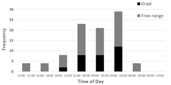 Lion predation on cattle was mainly concentrated during dark night hours, with 87.1% of incidents (n = 93) occurring between dusk and dawn (Figure 3). Enclosure-related depredation (n = 30 incidents) occurred exclusively at night, whereas lions sporadically killed free-roaming cattle during day-time hours too. Lions killed a median and modal number of 1.0 cattle per incident (range: 1–7). There were ten incidents, however, in which lions killed more than two cattle (4.20 ± 0.36), all of which occurred in non-predator-proof night enclosures. Of these 42 mortalities, lions left 13 carcasses untouched (31.0%), even when undisturbed, suggesting surplus killing. The mean cattle kill rate during enclosure-related incidents (2.2 ± 0.3 cattle, n = 31) was significantly higher than for incidents under free-range conditions (1.1 ± 0.0 cattle, n = 86, t = 6.12, d.f. = 1, p < 0.001). The mean number of lions involved in enclosure-related incidents (2.90 ± 0.37, n = 31) was significantly higher than the mean lion group size during free-range depredation incidents (2.25 ± 0.14, n = 77, t = 2.05, d.f. = 1; p = 0.021).