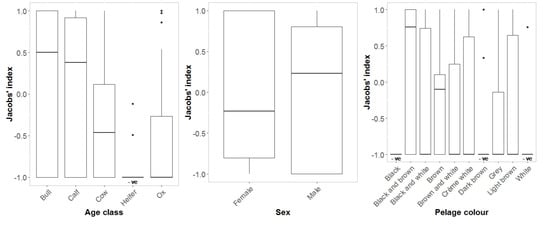 Comparison of mean (± 1 S.E.) Jacobs’ electivity index values for the age class of cattle (type), sex and pelage colouration. Categories that differ significantly from 0 are shown as “+ve” for significantly preferred and “-ve” for significantly avoided. Whiskers show upper and lower quartiles, dots represent outliers.