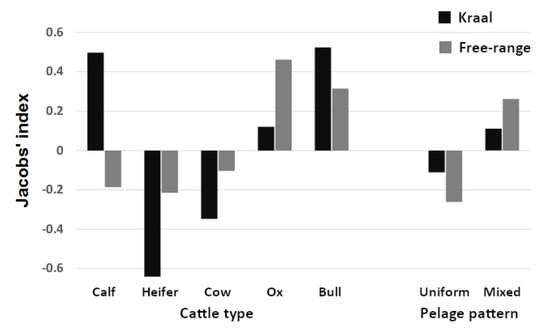 Comparison of context-specific Jacobs’ electivity index values for different cattle types and pelage patterns. Predation context includes free-ranging cattle herds in comparison with cattle confined in night enclosures near villages and cattle posts. “Mixed pelage” includes blotched and marbled coat patterns.