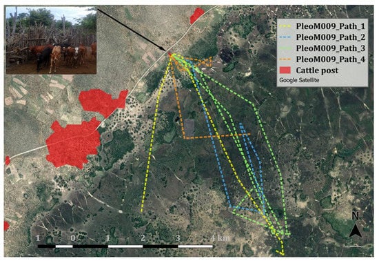 Map showing GPS paths of repeat visitations of male study lion PleoM009 during consecutive cattle depredation incidents at a nonfortified cattle post in 2018. Oriented movements resulted in five attacks during four nights between 18 January and 21 March 2018, with a total loss of seven cattle: four calves, two oxen, and one cow.