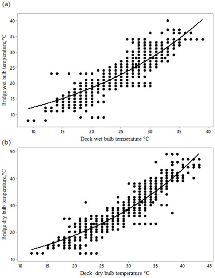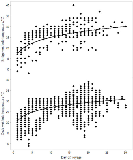 The mean 50th and 98th percentile values for average wet bulb temperatures in July to September have been measured in Kuwait (26.7 and 31.8 °C, respectively), Qatar, Doha (27.5 and 32.2 °C, respectively), United Arab Emirates, Dubai (27.7 and 31.5 °C, respectively), and Oman, Muscat (26.2 and 29.8 °C, respectively) [13]. Thus, if it is assumed that bridge TWB reflects temperature in these ports, there is a 50% chance that voyages offloading at Doha or Dubai between the months of July and September will cause an elevation of heat stress score. Voyages offloading at Kuwait and Oman present a slightly reduced risk. Our data also showed that bridge TWB increased from 25 °C to 30 °C from day 10 to the end of transport (Figure 1).