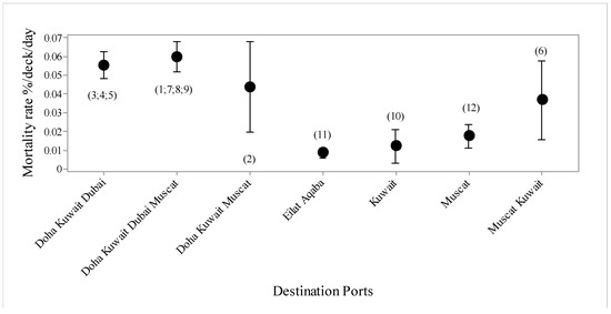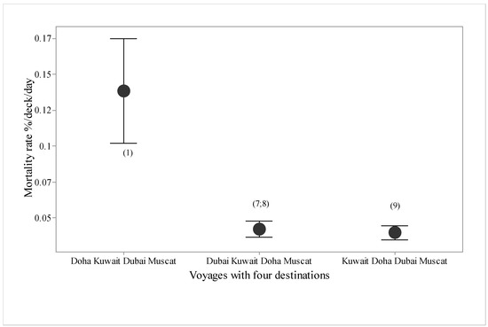 The study showed a correlation between destination ports and mortality rate. The first port destination was reached on average after 16.3 days (Section 2.1) and the highest mortality was recorded for voyages offloading at Doha as the first port for animal unloading (Figure 5). Thus, ships should offload to their furthest destinations first, which will have lower mortality rates, and only offload at Doha, a high-risk port, last.