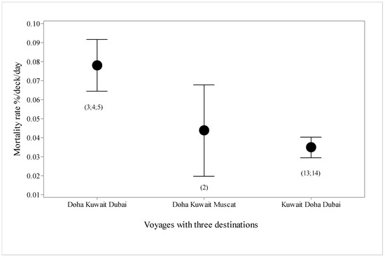 Mortality rate (%/deck/day with standard deviations) for voyages (n = 6, voyage numbers in parentheses) with three destination ports in different orders.