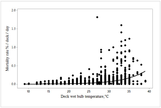 Mortality rate (%/deck/d) changes with bridge wet bulb temperature (°C) (n = 2798).