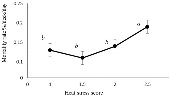 Mortality rates for heat stress character scores (with standard errors of the mean values) between 1 and 2.5. No scores of 3 were awarded. 1 = normal, 2 = moderate and 3 = severe. Means with different superscripts were significantly different (p < 0.05) by Fisher’s exact test.