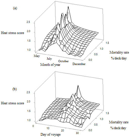 Relationships between heat stress score (1 = normal, 2 = moderate and 3 = severe), mortality and both month (a) and day (b) of the voyage.