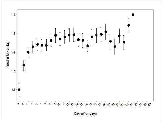 Feed consumption per sheep over the 27 days of the voyage (n = 3784).