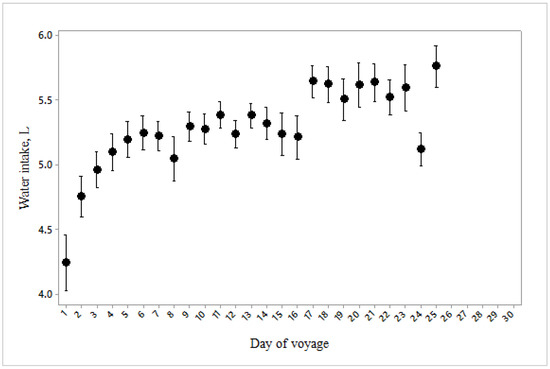 Water consumption per sheep during the 25 days of the voyage (n = 3581).