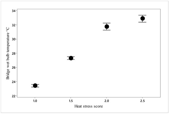 Our objective was to determine critical thresholds for reduced welfare at high temperatures, thereby facilitating improved control of the heat stress risk. The relationship between heat stress score and bridge wet bulb temperature determined that an increase in heat stress score to 1.5, i.e., between normal and moderate levels, occurred when bridge TWB reached 27.3 °C (Figure 16), a score of 2 being reached at 31.7 °C. At these scores, mortality rate was not significantly increased according to the model (Figure 10); however, the point of inflection of the curve in Figure 8 demonstrates that mortality begins to increase somewhere between 25 and 30 °C bridge TWB. Thus, welfare can reasonably be said to be impaired, as some heat stress has been recognised and there is limited evidence of increased mortality.
