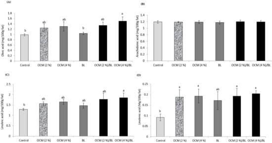 Muscle oleic, linoleic, and linolenic acids were influenced by OCM, BL, and their interaction (p < 0.05) (Figure 1; Table 4). Muscle oleic and linoleic acids increased significantly in broilers fed both OCM (4%) and BL, while linolenic acid increased in all groups except those fed BL and control diets (p < 0.05) (Figure 1). However, arachidonic acid was not affected by the test diets (p > 0.05).
