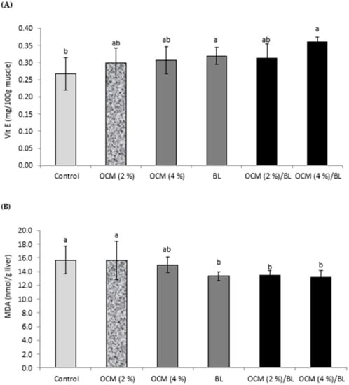 Regarding the muscle vitamin E, feeding OCM and/or BL increased the level of vitamin E in the muscle of broilers, which might be involved in reducing the lipid peroxidation process in broilers and, accordingly, in reducing the oxidation []. Oxidative emphasis normally happens when the creation and elimination of free radicals (ROS) are unbalanced, since the oxidative damage of cultured species is directly related to the quality of the diet [,]. Superoxide dismutase, glutathione peroxidase, and catalase are important scavengers of ROS, protecting the body tissues from oxidative stress damage []. Malondialdehyde (MDA) is a product of lipid peroxides and high levels of ROS, which can cause damage to the cell’s DNA, protein, and cytoplasm [,]. Interestingly, broilers fed OCM and/or BL showed reduced MDA, confirming that the known antioxidant properties of this probiotic are not lost when administered orally in broilers. Like the current study, earlier reports revealed improved antioxidant response by feeding probiotics [,].