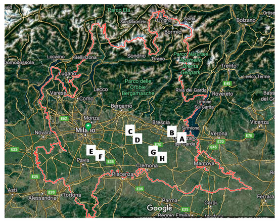Map of Lombardy region in which the localization of the eight sampled farms is reported. Farms A and B are in Brescia province; farms C, D, G and H are in Cremona province; farm E is in Pavia province and F in Lodi province.
