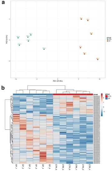 Regarding RNA-seq, the sequencing of 12 samples (2 groups × 6 animals/group) resulted in an average of~21 million reads per sample. A summary of the sequencing output is reported in Supplementary Table S1. After the assumption of a GP-supplemented diet for 60 days, 40 protein-coding genes were found to be differentially expressed in the GP group, of which 10 and 30 genes were down- and up-regulated, respectively (Supplementary Table S2). The most down-regulated gene in the GP group (FDR < 0.05) was the DnaJ heat shock protein family (HSP40) member A1. Additional interesting genes down-regulated by GP supplementation were the mitochondrial fission factor (MFF), the impact RWD domain protein (IMPACT), the ATP binding cassette subfamily A member 13 (ABCA13), the regulator of G-protein signaling 2 (RGS2), and the integrin subunit alpha 3 (ITGA3). The top 100 deregulated genes (using their normalized RNA-seq counts) were able to discriminate the two experimental groups either through a principal component analysis (PCA) plot (with the first 2 components accounting for > 60% of the total variability; Figure 1a) or by a hierarchical clustering heatmap (Figure 1b).