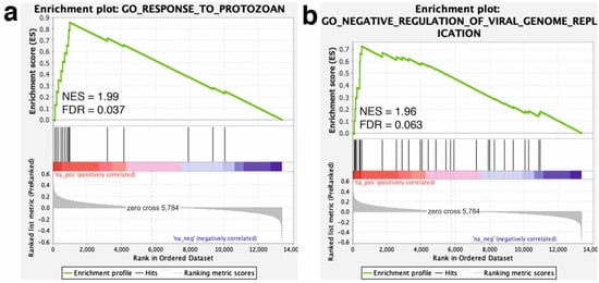 To further pinpoint the collective effect of the transcriptomic changes, we used GSEA to identify long-term GP-supplementation-associated pathways and biological processes. The GSEA analysis revealed that most of the core-enriched genes in the GP group, such as ‘interferon alpha (IFN-α) response’ (NES = 2.02), ‘IFN-γ response’ (NES = 1.94), ‘IL6-JAK-STAT3 signaling’ (NES = 1.74) or ‘complement’ hallmark genes (NES = 1.57), fell into the immune system-related hallmark gene sets (Figure 2). Moreover, some biological processes related with immune defense mechanisms were positively enriched in the GP group. Among these ones, the most enriched processes were the ‘response to protozoan’ (NES = 1.99) and the ‘negative regulation of viral replication’ (NES = 1.96; Figure 3). A summary of the GSEA analysis output is reported in Supplementary Table S3.