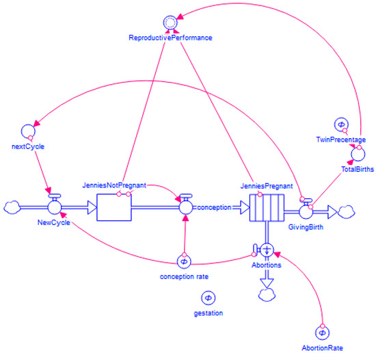 Stock and flow diagram of the reproductive performance model.