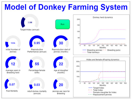 In the second step, a model of a farming system is applied to shed light on the likely time frame for developing a large-scale donkey farming system as well as on the herd characteristics of such a system. Figure 3 shows the interface of the model (Appendix C for the equations of the farming systems model and Appendix Figure A2 for the model diagram).