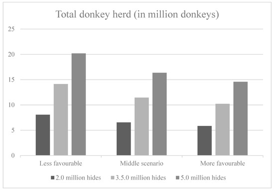 In the middle scenario for farming system performance, farming systems with 6.5 million donkeys, 11.4 million donkeys and 16.4 million donkeys are required for annual outputs of 2.0 million, 3.5 million and 5.0 donkey hides, respectively. Under the less (more) favourable scenario, the number of donkeys varies from 8.1 (5.8) million for 2.0 million hides to 20.2 (14.6) million for 5.0 million hides.