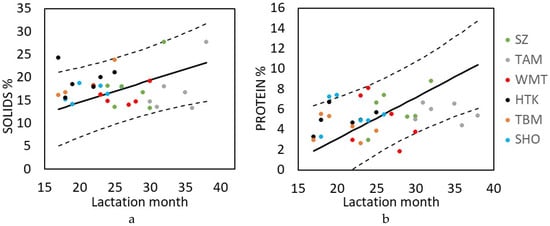 Variation in milk components with lactation month (calf age). Solids (a) and protein components (b) increased in later lactation months during late lactation in females’ milk. Points represent raw data for different mothers and solid lines show predicted values from the model with CLs (dashed lines). Predicted values drawn from the model according to reference categories and captive-born mothers. SZ, TAM, WMT, HTK, TBM, SHO: Elephant names coded as initials of house names.