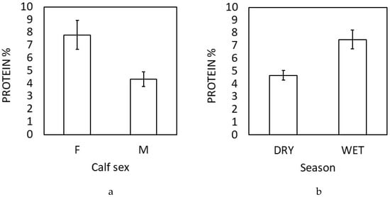 Sex and seasonal differences in protein composition of elephant milk. Protein composition was higher in milk of mothers with female calves compared to male calves (a) and protein content in milk was higher during the wet season compared to the cold, dry season in Myanmar (b). Figures show standard errors (error bars) and predicted means (bars).