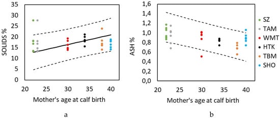 Maternal traits showed significant association with the variation in different milk components. Maternal age at calf birth had a significant association with the solids and ash components in the milk. Solids content increased 62.9% (β = 0.45 ± 0.18, p = 0.015, Figure 3a, Table S2) and ash content decreased 36.8% from a 22-year-old mother to a 40-year-old mother (β = −0.023 ± 0.005, p = 0.0002, Figure 3b, Table S5).