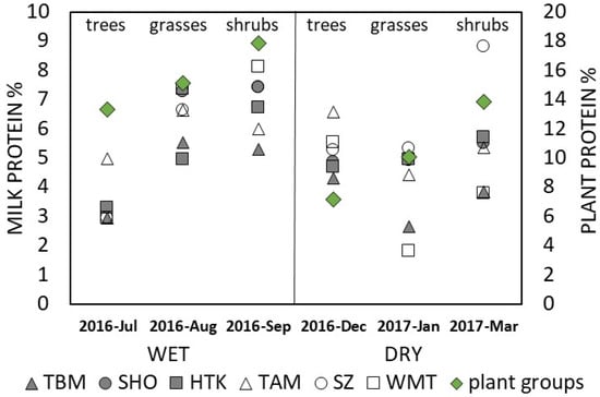 Seasonal changes in milk protein vs. forage protein by three plant groups. Milk and forage protein values were higher during wet season compared to dry season values (n = 36 milk protein values from six mothers, mothers identified by different symbols; n = 6 mean forage protein values (green symbols) of three different plant groups (trees, grasses, shrubs, according to Table 4).