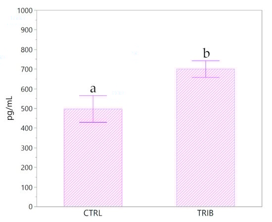 Serum insulin concentrations (pg/mL) in the control group (CTRL) and in the group of piglets fed a diet supplemented with 0.2% tributyrin (TRIB). Data are presented as the mean ± SE. a,b: significant differences between groups (p = 0.0187).
