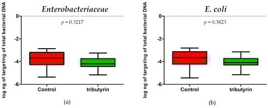 (a) Enterobacteriaceae abundance expressed as log ng of target/ng of total bacterial DNA in the faecal samples of the control group and in the group of piglets fed a diet supplemented with 0.2% tributyrin. (b) E. coli abundance expressed as log ng of target/ng of total bacterial DNA in the faecal samples of the control group and in the group of piglets fed a diet supplemented with 0.2% tributyrin.