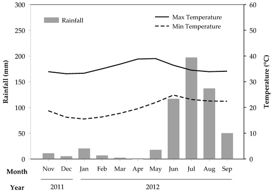 The study was carried out from December 2011 to September 2012, in the municipality of Apatzingán in the state of Michoacán, Mexico, at 19° 05’ N and 102° 21’ W and 325 m a.s.l. The soil is classified as a Vertisol (19% sand, 17% silt and 64% clay) according to FAO classification, with a pH of 8.1, 22.5 g organic matter kg−1, 5.8 mg P kg−1, 585 mg K kg−1 and 9356 mg Ca kg−1, all quantified according to Anderson and Ingram (1993) [8]. The climate is hot semi-arid with a mean annual precipitation of 924 mm and an average mean temperature of 28 °C [9]. The rainy season is from May to October, but rains are not completely absent in the remaining months. For the experimental period, the rainfall and temperature regimes are displayed in Figure 1.