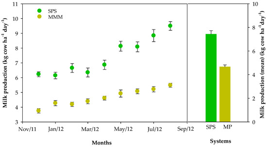 Milk production (kg cow ha−1 day−1) in the Silvopastoral System (SPS) and the Megathyrsus maximus in Monoculture (MMM).