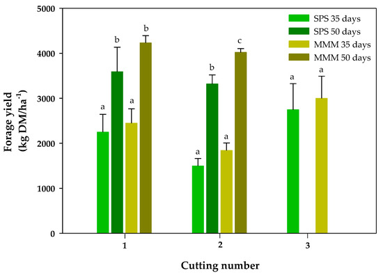 Total forage yield (kg DM ha−1) in the Silvopastoral System (SPS) and the Megathyrsus maximus in Monoculture (MMM) under two cutting intervals of 35 and 50 days.