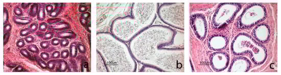 - Mossman, H.W.; Hoffman, R.A.; Kirkpatrick, C.M. The accessory genital glands of male Gray and Fox squirrels correlated with age and reproductive cycles. Am. J. Anat. 1955, 97, 257. [Google Scholar] [CrossRef]