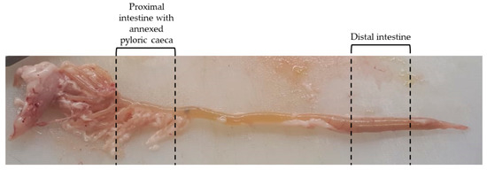 We collected segments of 2 cm of both anterior and posterior intestine. We defined as anterior intestine the tract comprised between the pyloric sphincter and the ileum-rectal valve. For consistency, we sampled only the segments with annexed pyloric caeca. We considered as distal intestine the tract downstream of the ileum-rectal valve characterized by larger diameter, darker pigmentation and circularly arranged blood vessels. For consistency, we collected all samples in the middle of this tract (Figure 1). Samples were immediately fixed in 10% neutral buffer formalin for 24 h at room temperature, dehydrated in graded alcohols, cleared with xylene and embedded in paraffin.