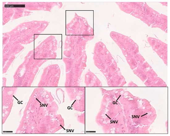 Hematoxylin/eosin (HE) stained section, showing the presence of enterocytes supranuclear vacuolization (SNV) and goblet cells (GC) in the pyloric caeca of 500 gr rainbow trout.