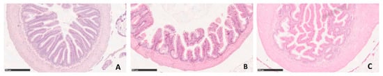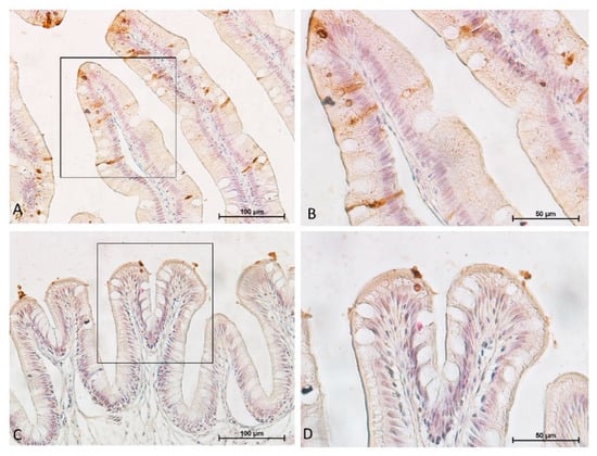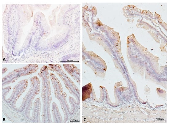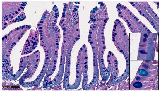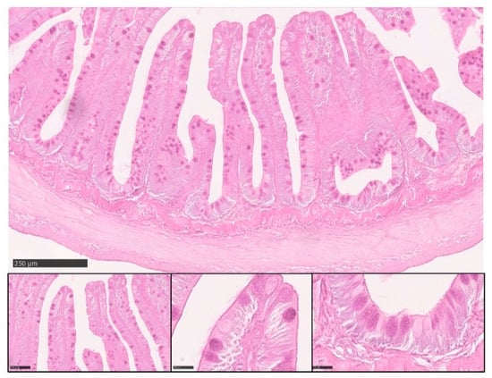 No inflammation features were observed, such as villi shortening and nuclear positioning disparity. Only a few intraepithelial lymphocytes were found confirming the animals’ healthy state.