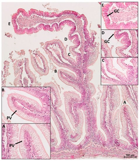 HE stained section of a complex fold in the distal intestine: parietal villi (A), as well as villi emerging from the basal part of the fold (B,C), were both covered by pinocytotic vacuoles (PV). At one point, the epithelium morphology along the fold, drastically changed: pinocytotic vacuoles tended to disappear (D). The apex of the fold presented goblet cells (GC) and non-vacuolated enterocytes (E).