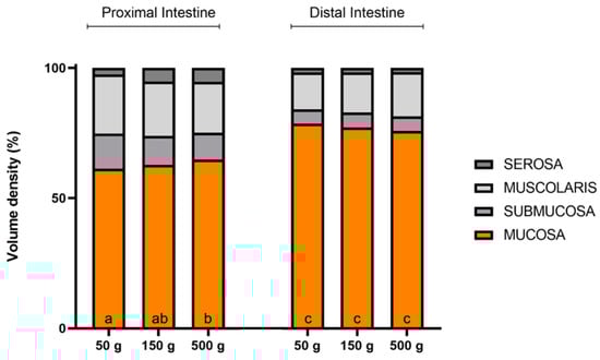 Volume density (Vv) estimation of rainbow trout’s intestinal layers in the proximal and distal intestine during growth. Data are expressed as a percentage of the whole intestinal wall. a–c Different superscripts in the same layer indicate significant differences (p < 0.05) determined by two-way ANOVA (animal weight and intestinal tract: independent variables).