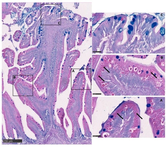 Alcian Blue–Periodic acid–Schiff (AB-PAS) stained section showing the presence of numerous PAS-positive pinocytotic vacuoles (arrows) on the villi of the distal intestine (A), as well as, on the basal part of the complex folds (B); whereas, they were completely absent at the fold apex (C).