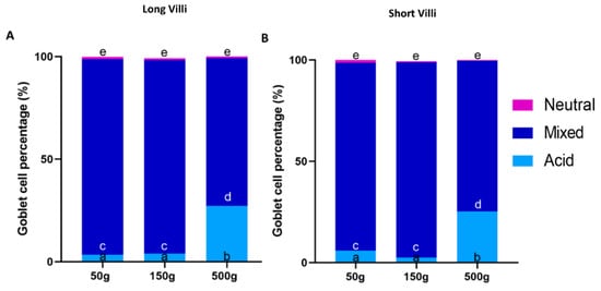 Estimation of the percentage of goblet cells secreting acid mucins (AB positive), mixed mucins (AB/PAS positive) and neutral mucins (PAS positive) in the proximal intestine of both short (A) and long (B) villi along rainbow trout development. a–e Different superscripts within the same histogram indicate significant differences (p < 0.05) measured by one-way ANOVA (animal weight: independent variable).