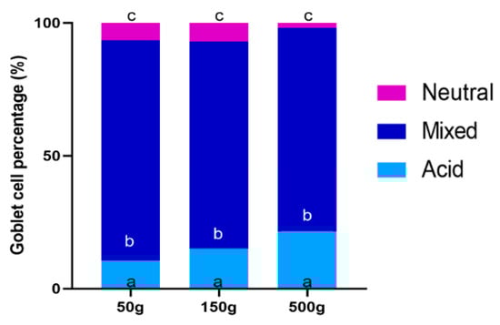 Estimation of the percentage of goblet cells secreting acid mucins (AB positive), mixed mucins (AB/PAS positive) and neutral mucins (PAS positive) in the pyloric caeca along rainbow trout development. In this region, the quality of mucus secretion remained constant along development. The same superscripts a–c within the same histogram indicate no significant differences (p > 0.05) measured by one-way ANOVA (animal weight: independent variable).